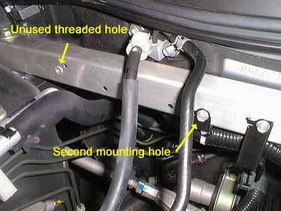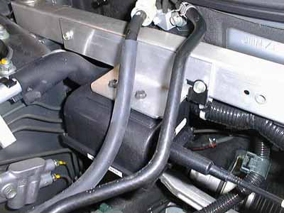 To mount the cruise control module, you can either use the bracket provided by Rostra or build a custom bracket. I opted for the latter because I didn't feel like drilling any holes in my car, and it just so happens that there's a perfect place to mount it, and the Rostra-supplied bracket's holes aren't spaced right. The mounting location I used is on the passenger side, on the aluminum box beam just in front of the firewall. As shown in the photo, there is an unused threaded hole on the left, and a conduit support bolted in on the right that I used to mount the bracket. | ![]() |