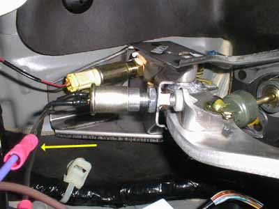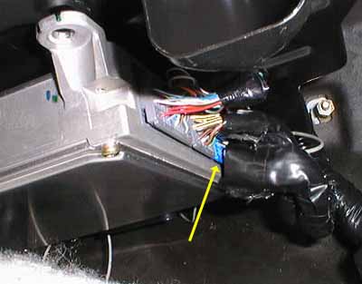 I used a tap connector to tie the VSS wire (gray) to the blue/white wire. When done, I carefully reinserted the blue connector and replaced the panel and carpet. |