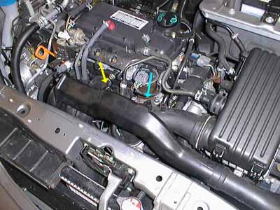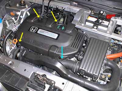 The first thing I did was remove the plastic cover on top of the engine. It isn't absolutely necessary but I found it helpful. I had to remove three 10mm acorn nut fasteners with washers (yellow arrows). The acorn nut at lower left in the photo (on my car, anyway) came off with the threaded rod, which I assume was intentional. To remove the cover, I unhooked the cover from where it snaps into the rubber intake hose (blue arrow). |