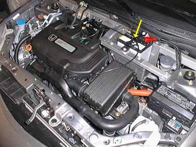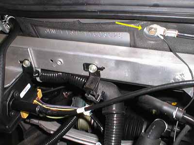 Here's what the inside of the engine compartment looks like now. The only non-stock item readily visible is the cruise control cable, which is zip-tied to the battery retainer strap (yellow arrow). | ![]() |