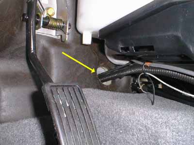 Next, I ran the cruise control wiring harness into the passenger compartment. I didn't want to drill any holes in the car, so I used the existing hole where the heater control cable passes through. You can find this easily by looking under the dashboard to the right of the accelerator pedal (see photo). I disconnected the two four-pin connectors on the harness and carefully passed them through the hole, next to the heater cable. These connectors are just barely able to pass by the cable, so I had to be careful not to damage them while cramming them through! I wrapped the wires in the plastic sheath provided and cable-tied the bundle neatly in the engine compartment. |