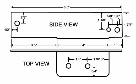 My bracket is 8.5" long. I drilled two bolt holes on the back side and an alignment hole for the conduit support bracket on the right. The bottom is cut to clear the air-conditioner hose on the left and the conduit support on the right, and drilled to accommodate the Rostra unit's two bolts. A measured drawing of this bracket can be found here. |