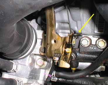 The next thing I did was loosen the throttle cable's flanged hex nut, carefully holding the throttle cable sheath so that the second nut, holding the cable below the metal bracket, didn't move. I loosened this flanged nut a few turns, and slipped the Rostra-supplied cable bracket under the flange as shown at right (yellow arrow). I tightened the nut securely. | ![]() |