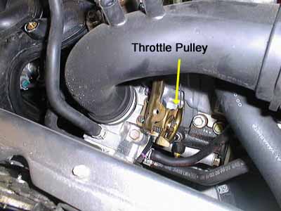 Here's how the throttle assembly looked at this point. You'll see the gold throttle pulley with the throttle cable coming off it at the rear. Follow the cable upward and you'll see where it is fastened to a gold-colored metal bracket with a flanged hex hut (see next photo, below) |