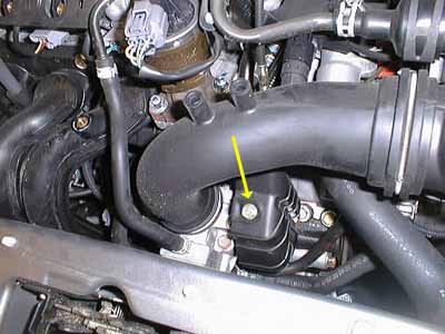 Once the big cover is off, I had to remove the rubber intake horn, which is right behind the hood latch and sits on top of the throttle area. To do this, I removed the 10mm bolt (yellow arrow) and unhooked the intake from where it snaps into the rubber intake hose (blue arrow). Then I lifted up the intake horn and wiggled it out of the friction-fit connector in front of the air filter box. |