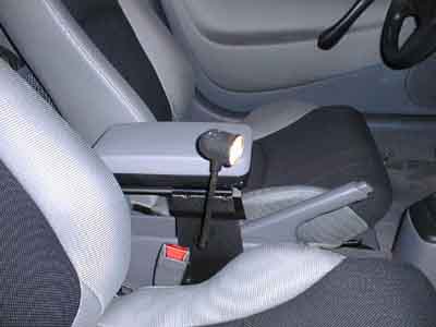 Anyhow, my idea was to install a second 12V outlet on the armrest's passenger-side support strut. With a power outlet there, it would be possible to plug in all sorts of things, including our handy-dandy gooseneck map light. A quick trip to Radio Shack, and I bought a Dash-Mount DC Accessory Outlet, Radio Shack part number 270-1539A. This nifty little outlet is made to pop into a 1-1/8" hole and put a power outlet anywhere you want it.