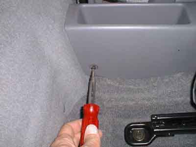 With the outlet mounted in the armrest support, it was time to remove the handbrake cover. This is a real no-brainer: I removed two screws from the back of the cover and removed it by sliding it forward about a half-inch and lifting.