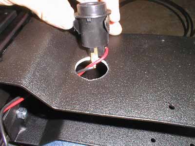 I chucked a 1-1/8" hole saw into my drill press and made a nice, neat hole in the passenger-side bracket (it drills very easily, being aluminum). The outlet has a couple of "ribs" on the sides and I filed a couple of small notches to clear these. Once the hole was drilled, I simply inserted the outlet into the hole and it snapped into place as if it had been there all along!