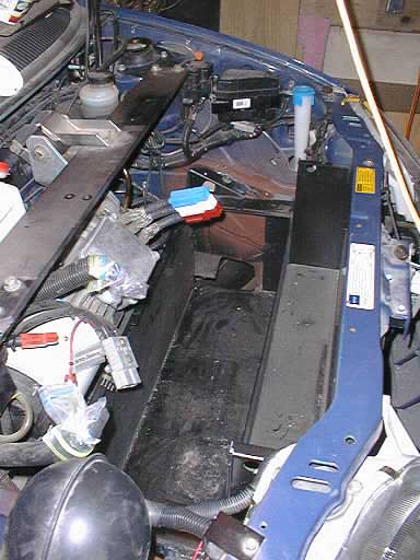I knew that at the very least, I was going to have to remove the big aluminum hanger bar that runs between the shock towers over the motor. This bar would have definitely been in the way of the battery box. Since the motor hangs from this bar, I looked at the supports and decided that I could put a block under the motor and remove the hanger bolts without it moving. The front of the car was up on jack stands and was nice and stable, so I cut a 2x4 to the proper length and wedged it into place. I then pulled the two large bolts that tie the motor to the hanger and nothing moved. So far, so good.