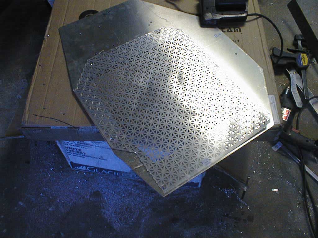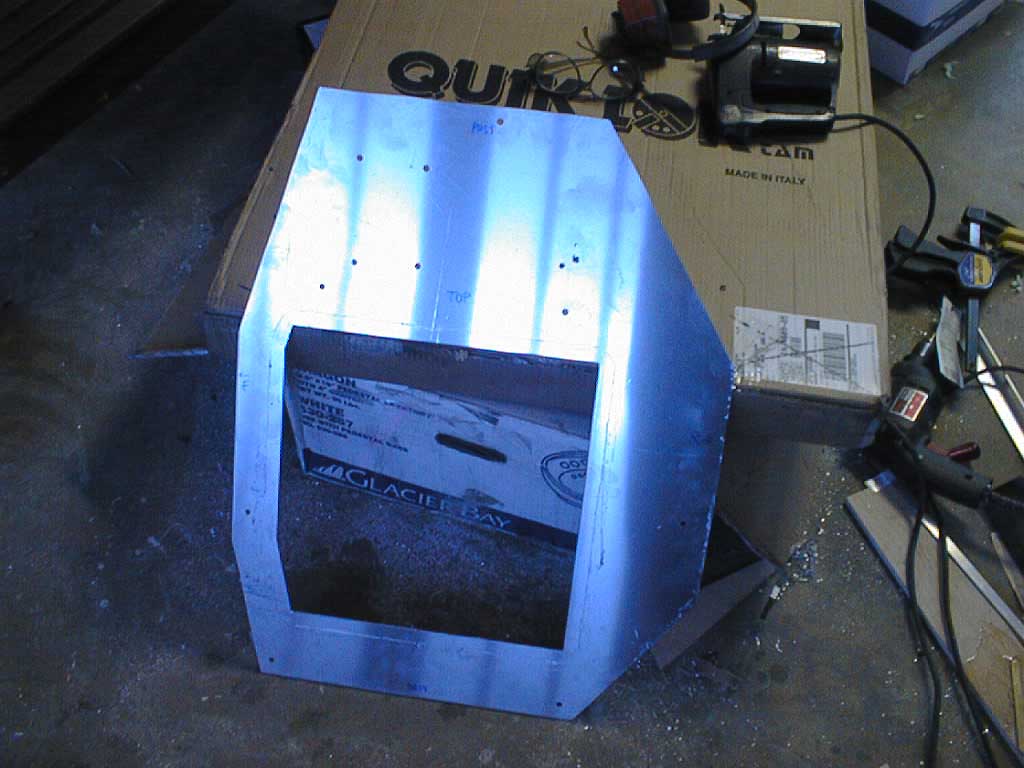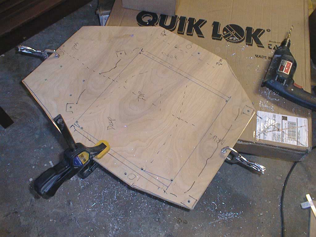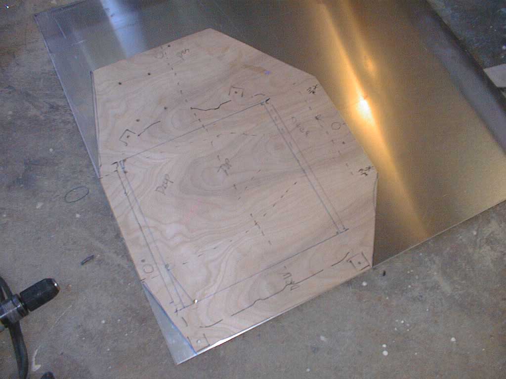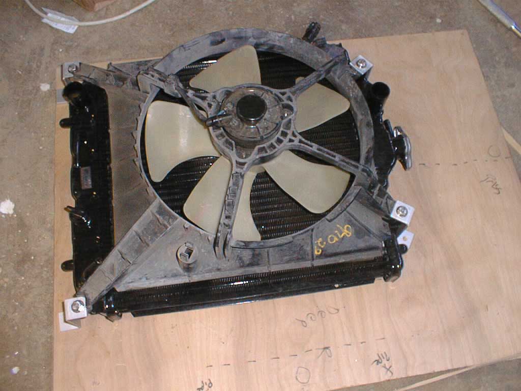 I attached the fan/shroud to the radiator and also fabricated a set of aluminum brackets that would be used to secure the radiator assembly to a mounting plate, and whipped up a template made out of scrap 1/4" plywood that I'd use to mock up the mounting plate, which would eventually be made from aluminum sheet.