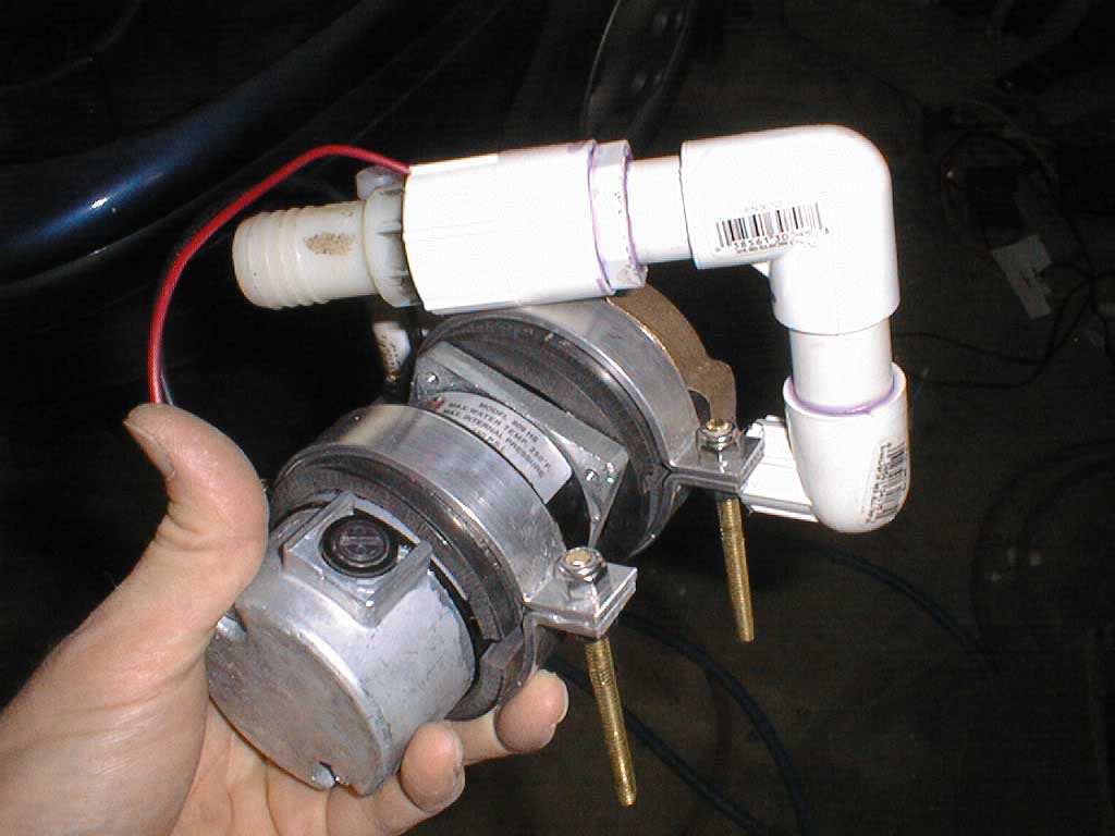 Next up was to figure out how to mount the coolant pump to the radiator mounting plate. I didn't get any detailed sketches of this from Solectria's NiCd car, so I was totally winging it. The main thing was to have a secure mounting that didn't transmit a lot of vibration into the vehicle chassis. My solution, after many hours of fiddling with various orientations and locations, was to fabricate two clamp-type brackets that would have rubber bushings between them and the pump body. I bought a 3" rubber pipe joiner, which has a thickness of 1/4" -- This would be a perfect bushing material. The clamp straps themselves were made from 3/4" x 1/8" aluminum, bent around a piece of scrap pipe about the same size as the pump with the rubber bushing in place. These were bolted to a threaded brass rod that would act as a standoff from the mounting plate. I attached the PVC pipe fittings that would connect it to the radiator hose and the 5/8" main coolant hose, and did a test-fit of the assembly on the wood mounting plate mockup. A quick slide under the car with the assembly verified that it would fit perfectly.