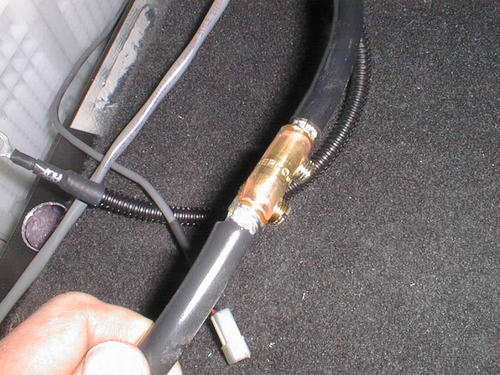 May 21: Today I ran the two hoses down from the rear battery box to the fan/pump assembly under the car. I also routed two 5/8" hoses from the fan/pump assembly to the front battery box, fabricating special aluminum clamps that would hold the hoses securely under the car in the "tunnel" in the middle. The only hassle here was that the best place to secure these hoses under the driver and front passenger seats was the plate covering what used to be the shifter opening in the floor of the vehicle. Removing these bolts to attach my brackets turned out to be a big job because these bolts are used to secure the Solectria power selector! I wound up taking a lot of time to get this properly attached. I also replaced the original bolts used for this (steel) with stainless steel bolts, as the originals had rusted pretty badly. Next I moved to work on the battery charger's connection to the amp-hour counter. For this, I was going to need three wires. Fortunately, my previous battery pack had a five-wire harness running to the front battery box as part of the battery monitoring system. I simply brought these wires into the car through the firewall and behind the dashboard to the general area of the amp-hour counter box, which sits just below the steering column. Three of these wires would be used for the amp-hour connection to the charger, and the other two would supply power to the cooling system fan and pump.