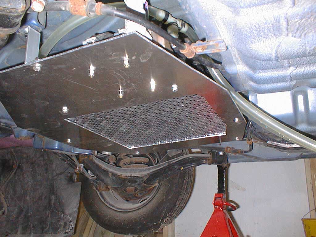 May 20: Now that the mounting plate mockup was finalized, I cut the real thing from a sheet of 1/8" thick aluminum. Using the plywood template, I located and drilled all the bolt holes and cut the opening for the radiator grille. When finished, I bolted everything to it, put together the proper wiring harness and connector, connected the cooling hoses and hooked it up to a 5-gallon bucked filled with water as a test. I started up the unit and it worked perfectly, pumping the water at an impressive rate. With that test out of the way, I connected the real hoses and mounted it under the car. Photos below: