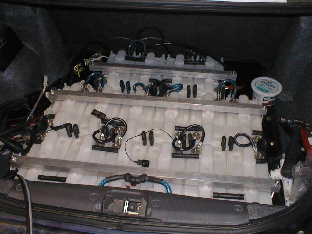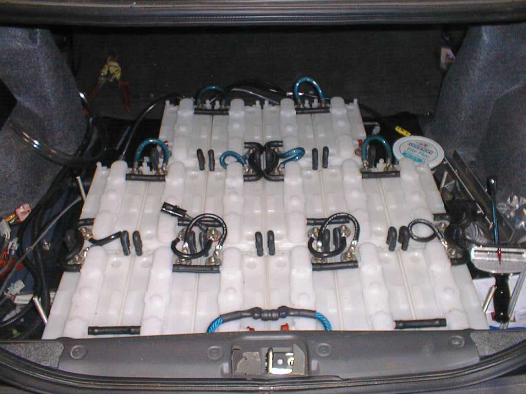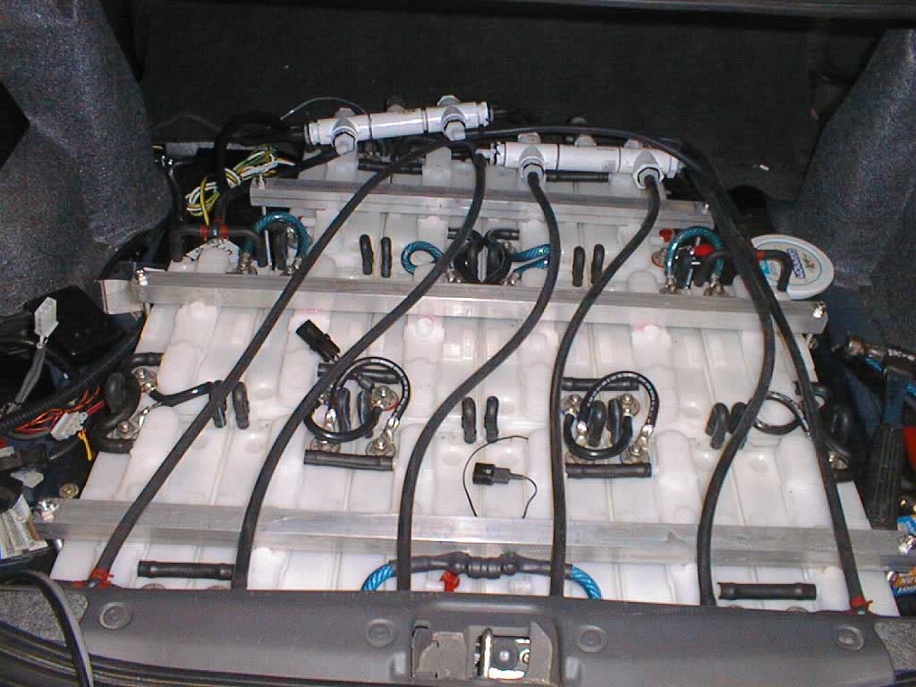 Believe me, there is a lot of air in a system like this, as the empty coolant pockets in the batteries are replaced by fluid. It took several hours before I was satisfied that the system was clear of air. I then re-mounted the radiator and pump under the car and called it a night.